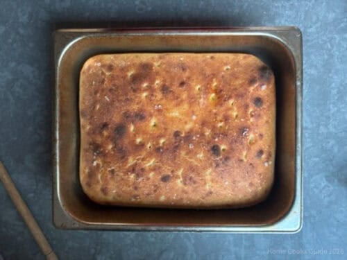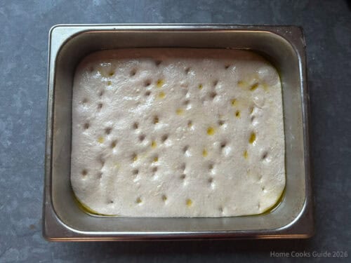 Oil a 9×13” pan. Shape the dough into a ball and place it in the pan. Rub the surface with olive oil. Cover with plastic wrap and refrigerate for 8-12 hours.